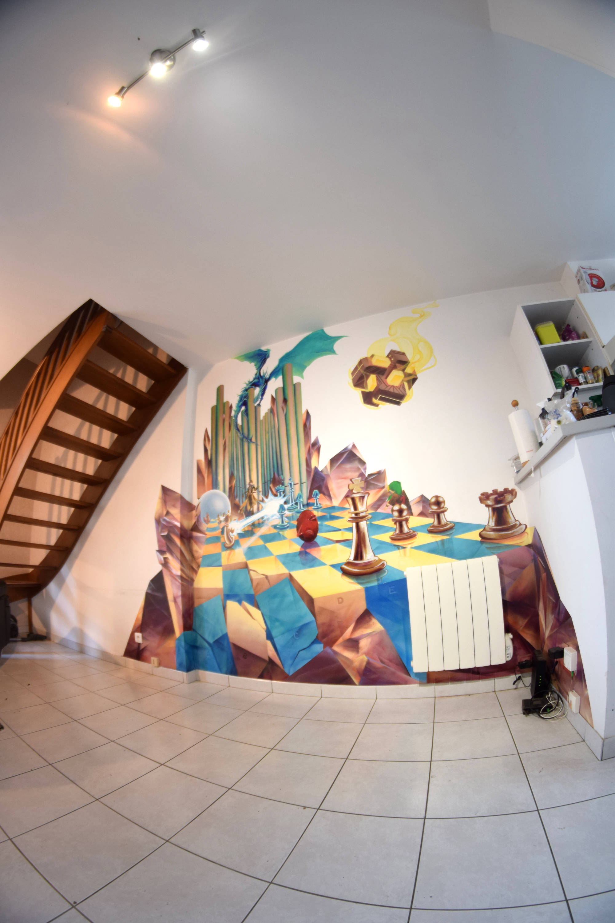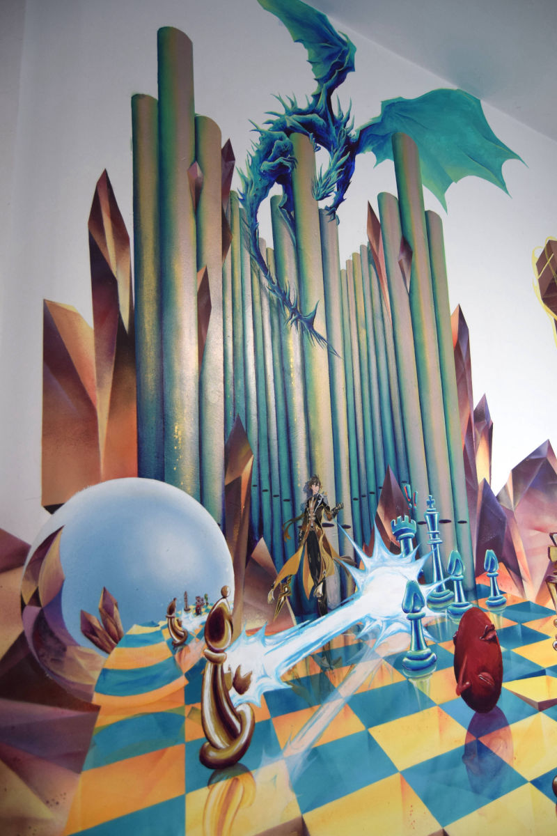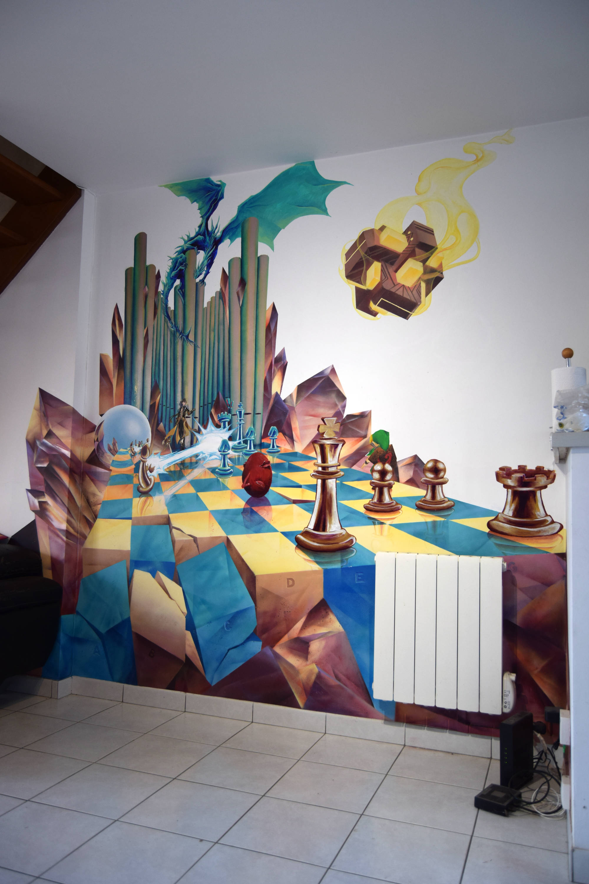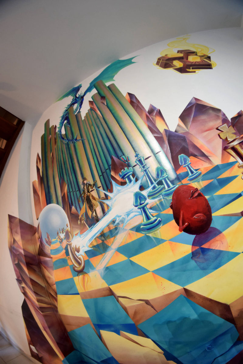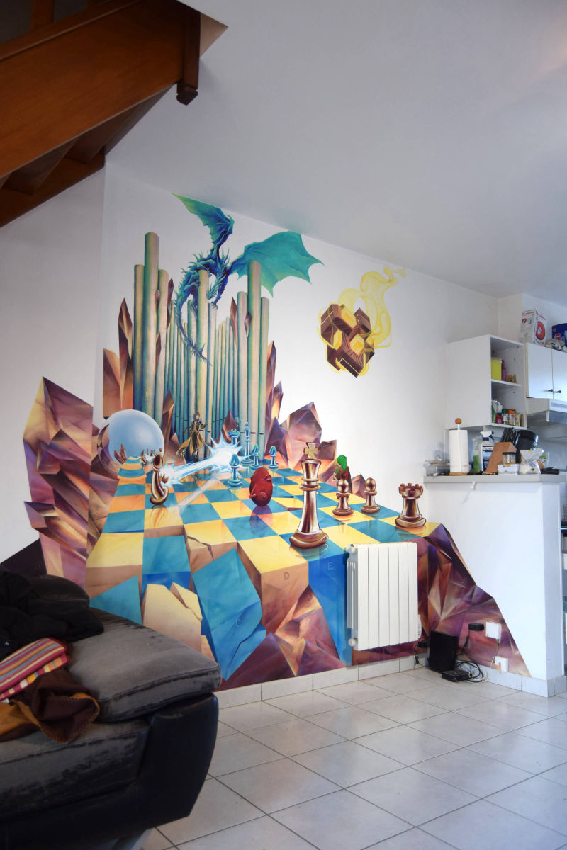 Fresque réalisée chez un particulier avec pour thèmes les échecs, l'orgue et l'heroic fantasy. Le décor a été peint à la bombe tandis que les personnages ont dûs être faits au pinceau pour atteindre un niveau de détail plus élevé.
