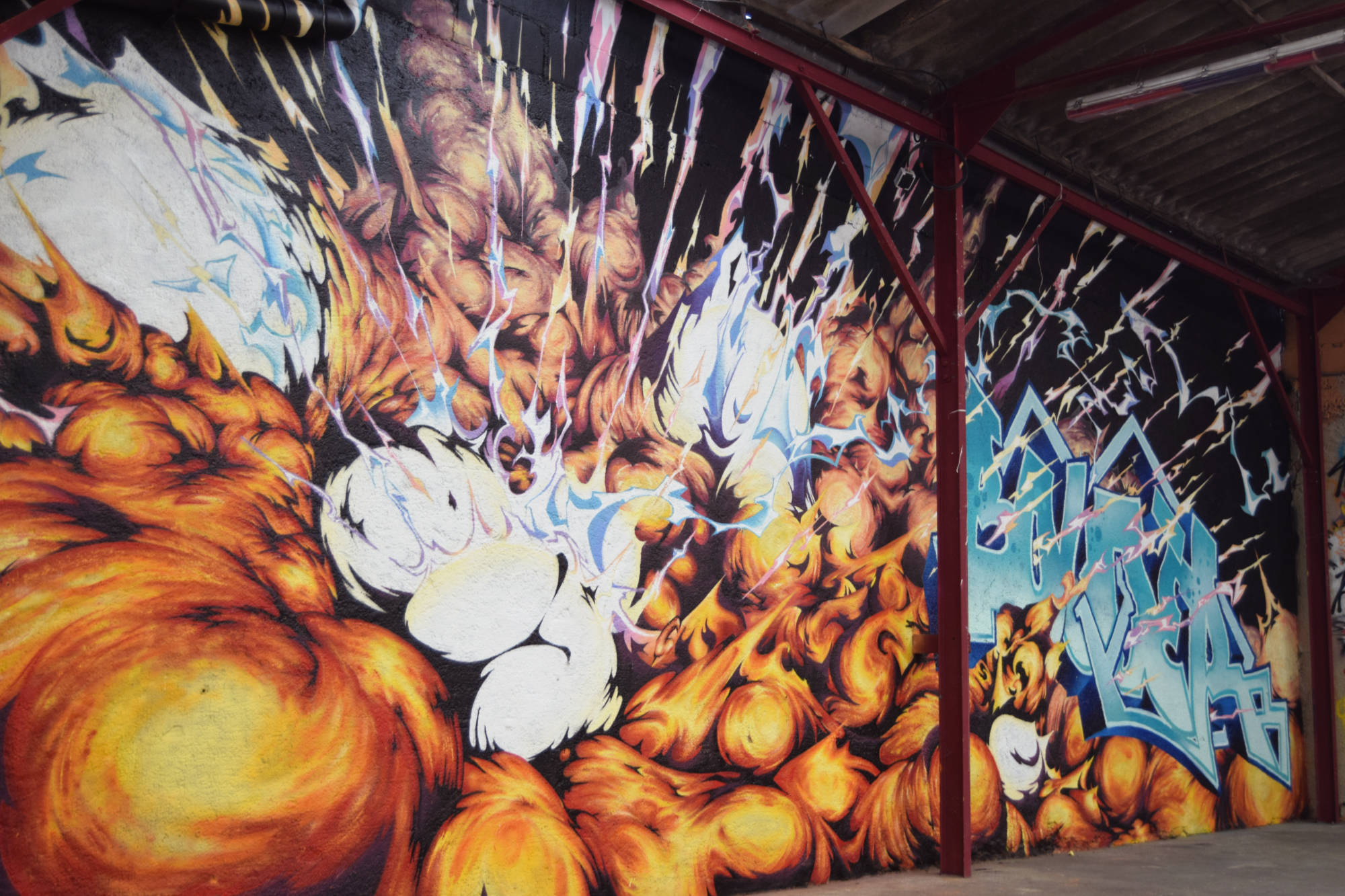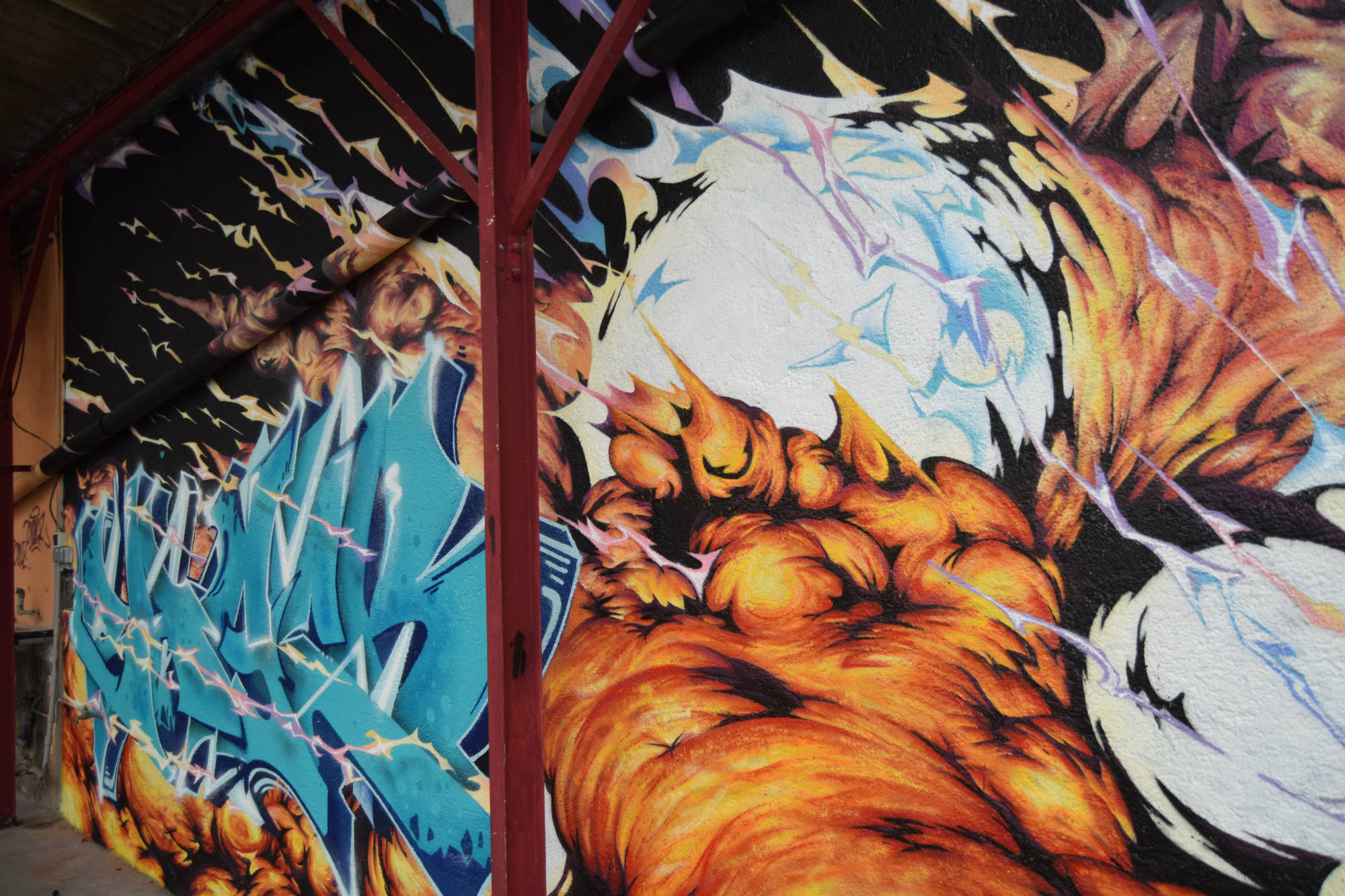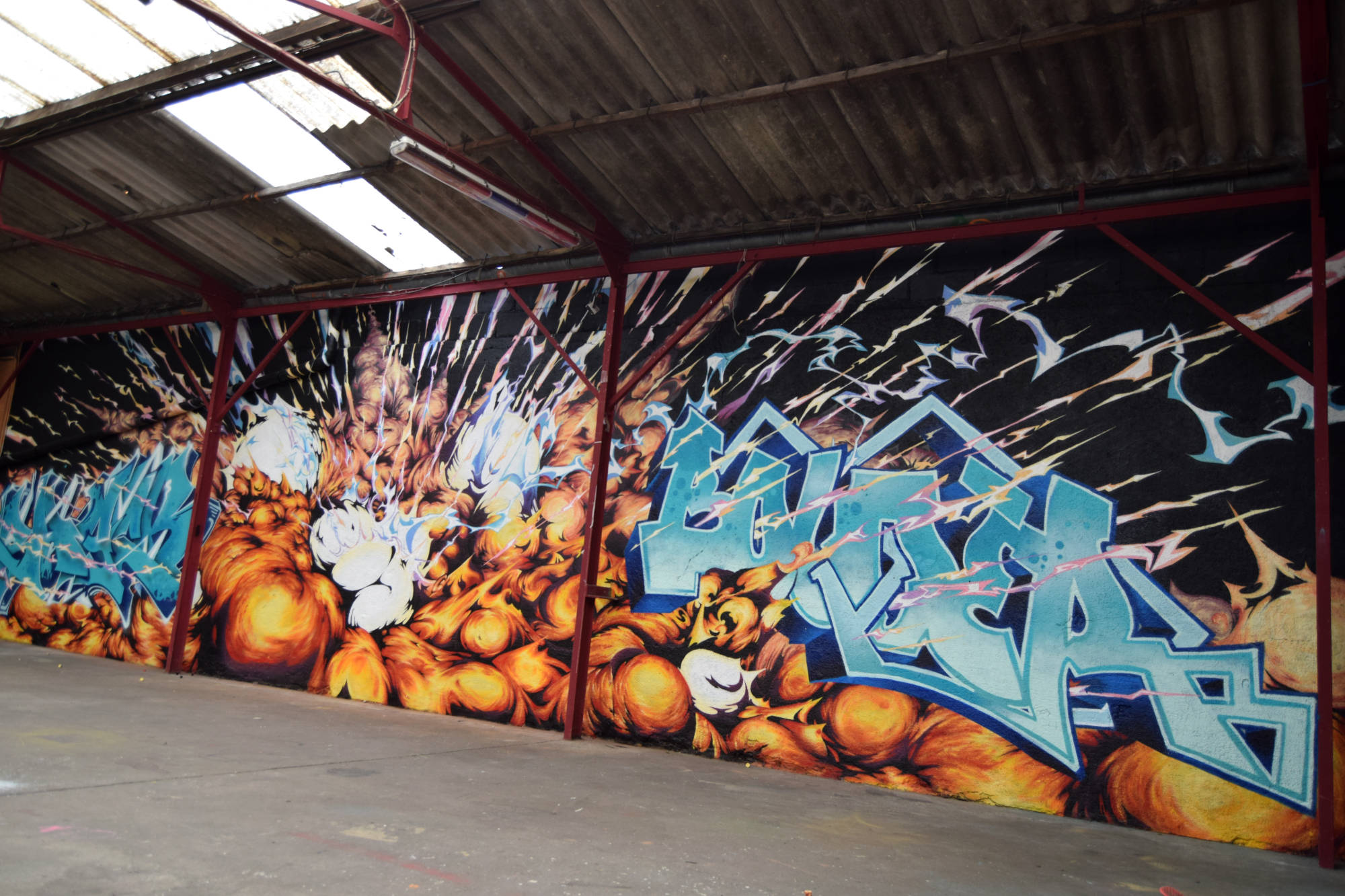 Fresque réalisée chez un particulier à Nantes en 2020, avec une explosion traversant des lettrages dessinée dans un style inspiré de l’univers des comics et mangas.