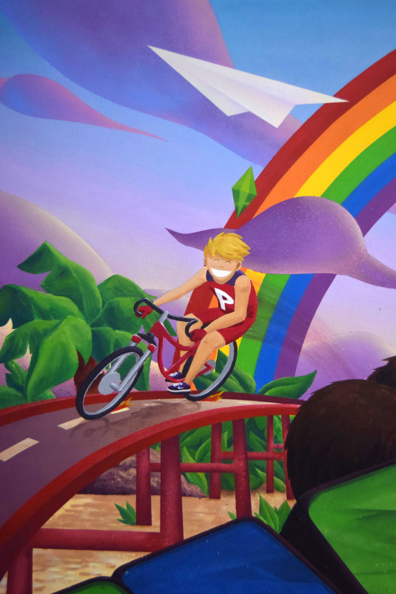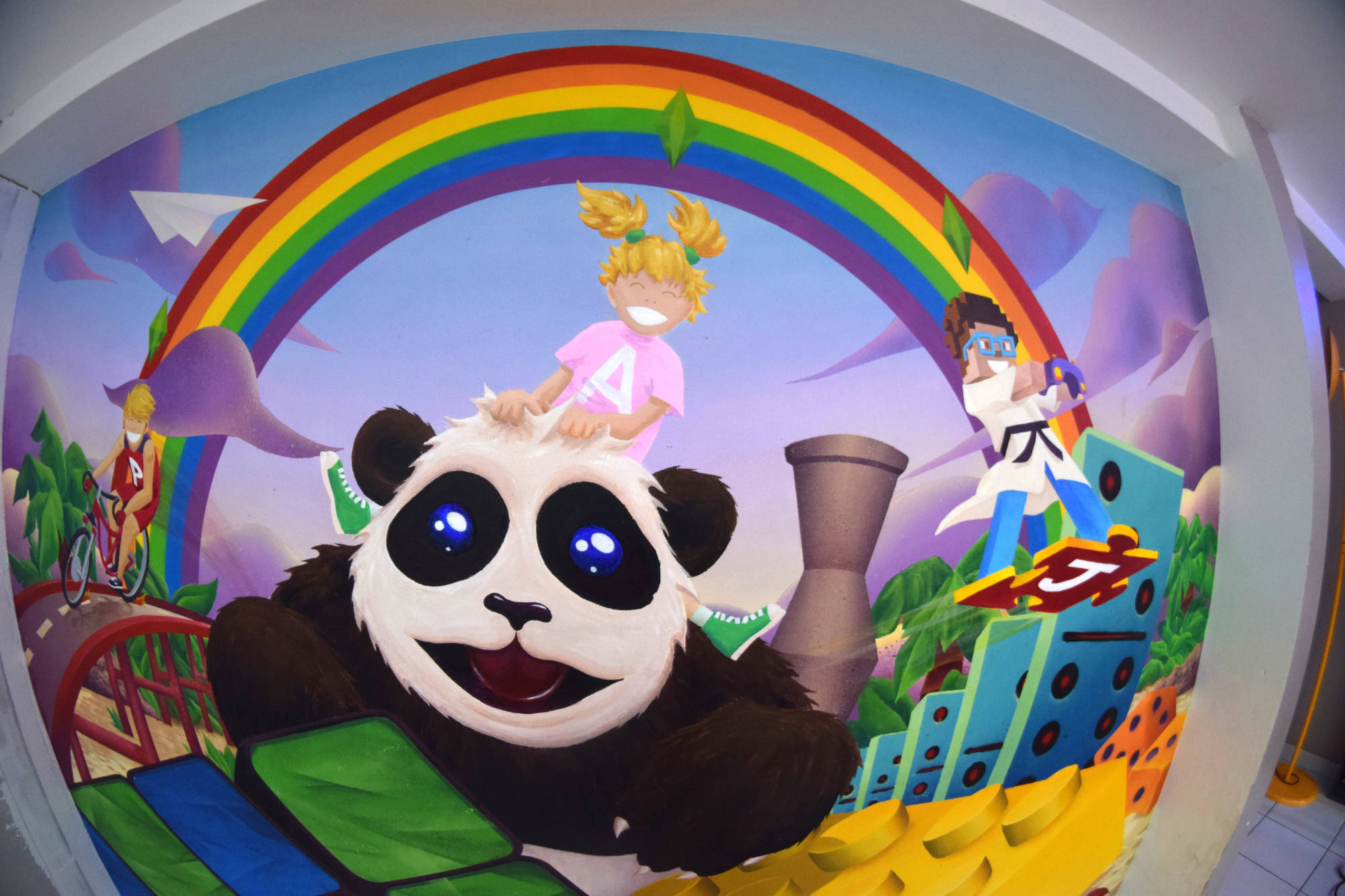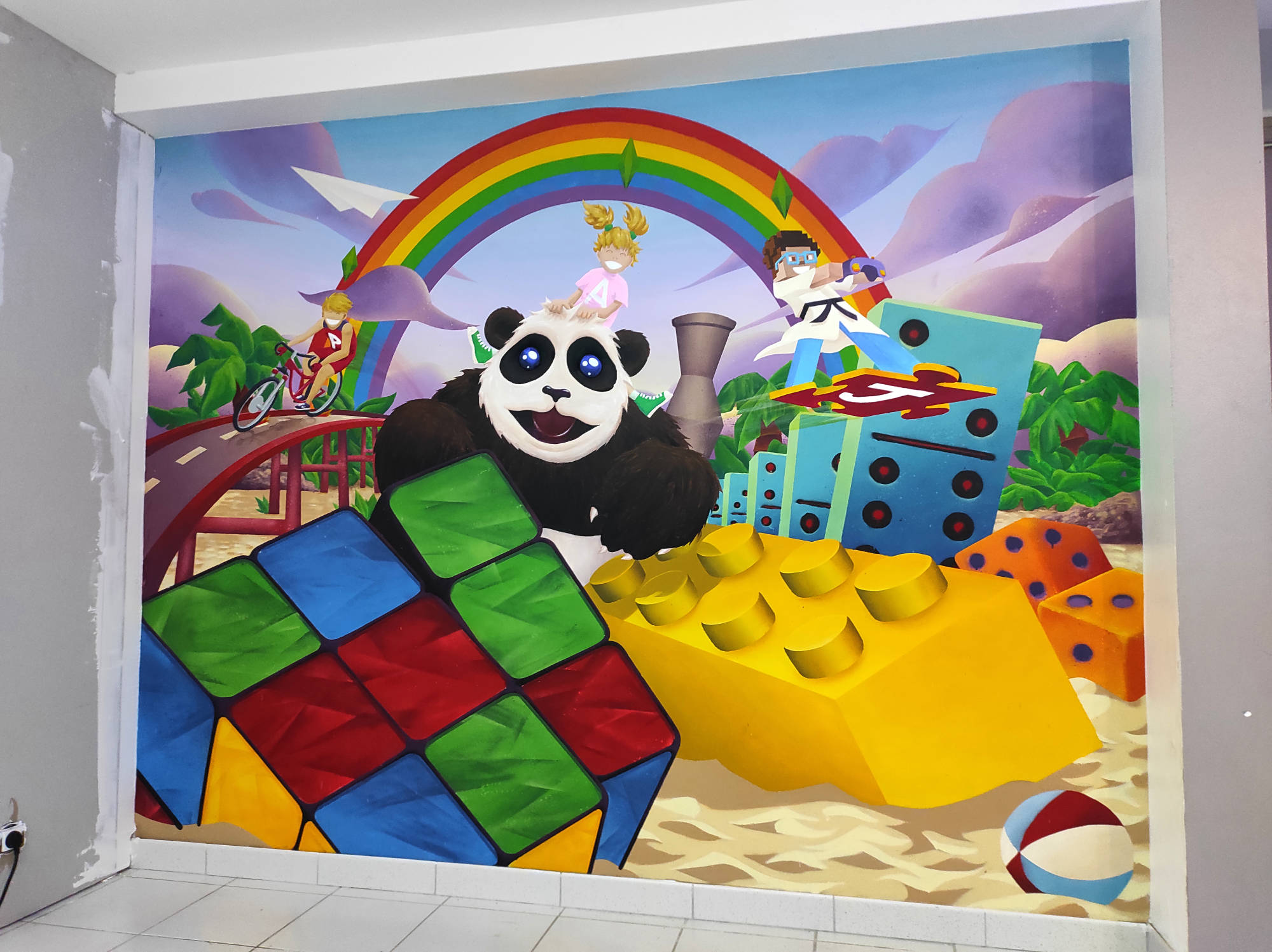 Décor pour des particuliers dans la salle de jeux de leurs enfants, Paul, Jules et Anna, avec des personnages à leur effigie.