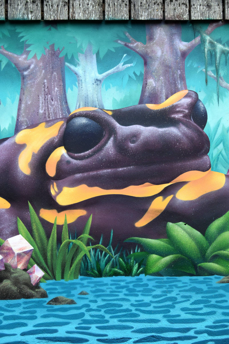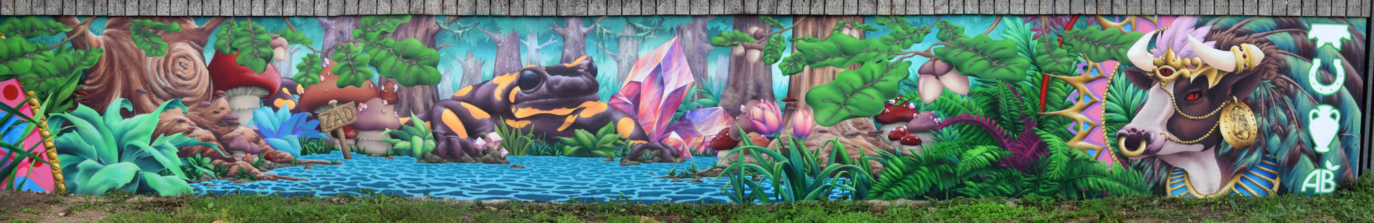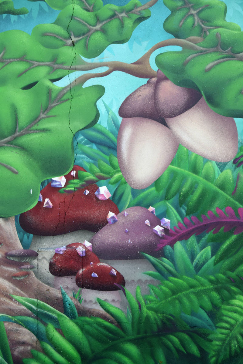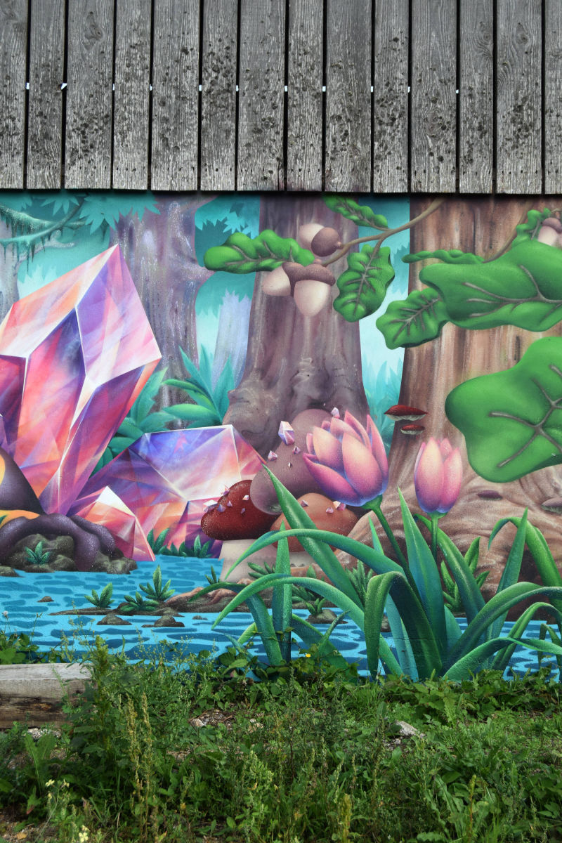 Décor végétal pour la ferme de Saint-Nom à la Turballe, productrice de lait bio. La seule contrainte était d'exploiter une faune et une flore locale, à laquelle j'ai pu superposer une dimension fantasmagorique en ajoutant des cristaux, et en faisant certains éléments surdimensionnés comme la salamandre ou les champignons.